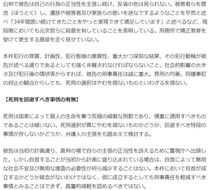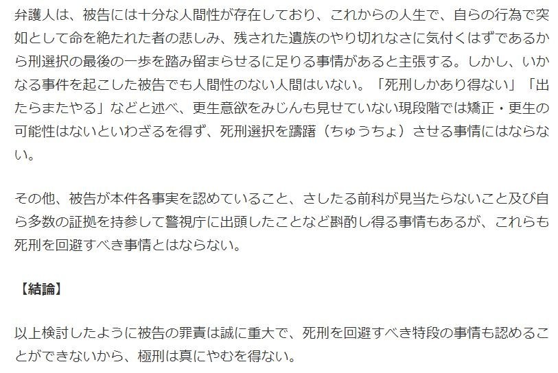 本件犯行の罪質、計画性、犯行態様の悪質性、重大かつ深刻な結果、その犯行動機が被告が述べる通りであるとしても強く非難されなければならないこと、社会的影響の大きさ及び犯行後の情状等からすれば、被告の刑事責任は誠に重大。罪刑の均衡、同種事犯の抑止の観点からしても、死刑の選択はやむを得ないものといわざるを得ない。
