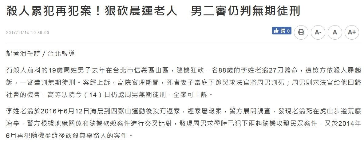 有殺人前科的19歲周姓男子去年在台北市信義區山區,隨機狂砍一名88歲的李姓老翁27刀斃命,遭檢方依殺人罪起訴,一審遭判無期徒刑。案經上訴,高院審理期間,死者妻子當庭下跪哭求法官將周男判死;周男則求法官給他回歸社會的機會,高等法院今(14)日仍處周男無期徒刑。全案可上訴。