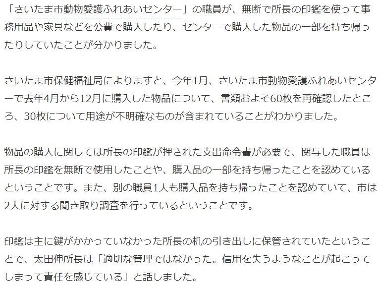 「さいたま市動物愛護ふれあいセンター」の職員が、無断で所長の印鑑を使って事務用品や家具などを公費で購入したり、センターで購入した物品の一部を持ち帰ったりしていたことが分かりました。