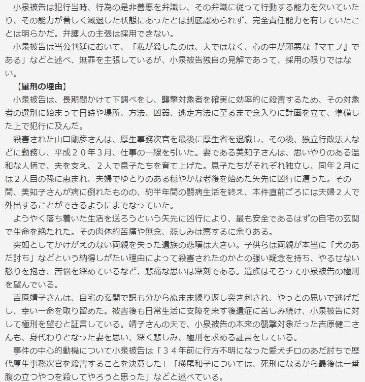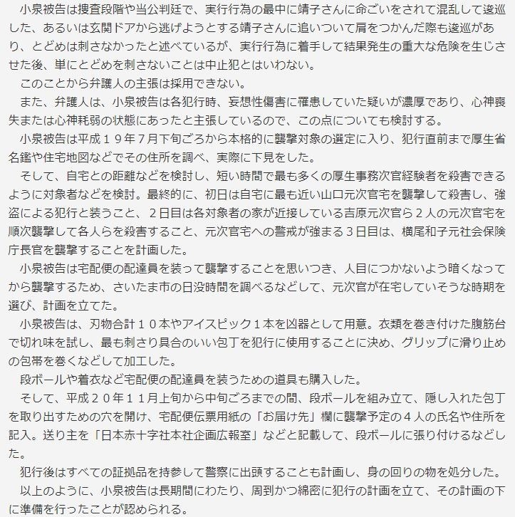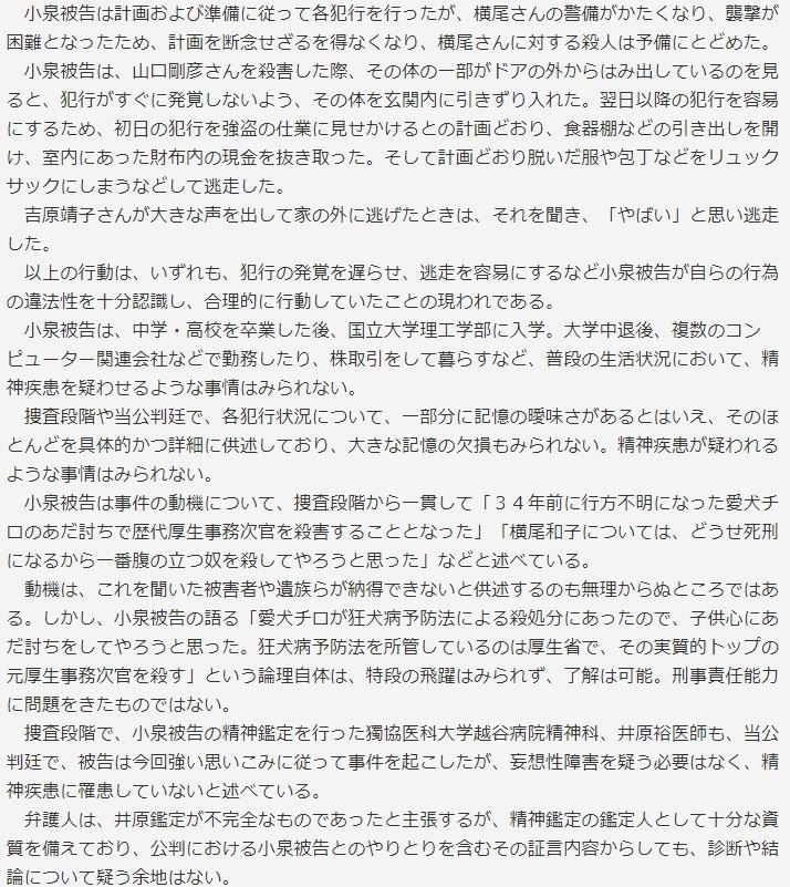 犯行の罪質や計画性、犯行態様の悪質性、重大かつ深刻な結果、その犯行動機が小泉被告が述べる通りだとしても、強く非難されなければならないこと、社会的影響の大きさや犯行後の情状などからすれば、犯行の評価としては、小泉被告の刑事責任は誠に重大で、罪刑の均衡、同種事件の抑止の点からしても、死刑選択はやむを得ないものといわざるを得ない。