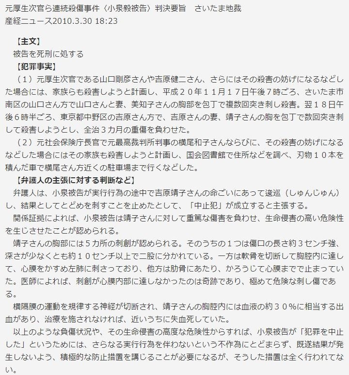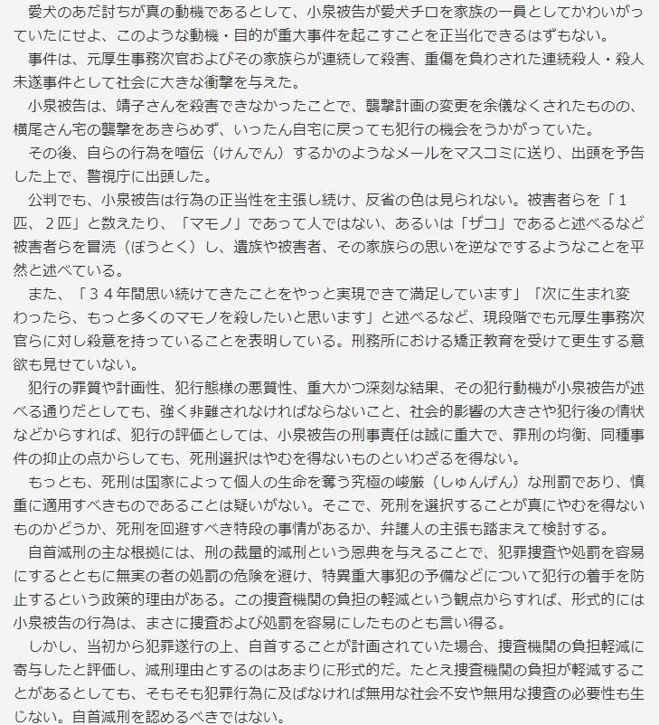 小泉被告にさしたる前科が見あたらないこと、自首減刑すべきではないが多数の証拠を持参して警視庁に出頭したことなど、斟酌(しんしゃく)し得る事情もあるが、これらもまた、死刑を回避すべき事情とはならない。以上検討したように、罪責は誠に重大であって、死刑を回避すべき特段の事情も認めることができないから、極刑は真にやむを得ない。