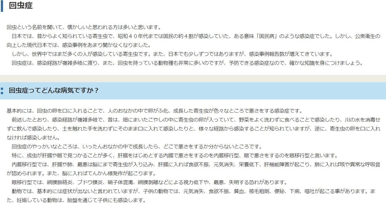 基本的には、回虫の卵を口に入れることで、人のおなかの中で卵がふ化、成長した寄生虫が色々なところで悪さをする感染症です。