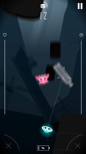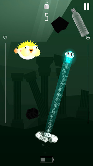 遊戲操作只需簡易的按壓螢幕,小水母就會集氣並衝撞瞄準的垃圾。但是要注意在海中優游的其他魚類,千萬別撞傷他們囉。除此之外,適當地集氣能累積D的電量,當電量滿了後就可以進入無敵模式和釋放大絕。