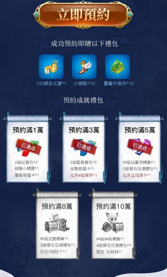 除了遊戲內元寶和道具以外,事前登錄滿3萬人時,參與玩家將獲得紅色四階腰帶;事前登錄參與人數滿5萬人時,參與玩家將獲得藍色五階護手,事前登錄參與人數滿8萬人時,參與玩家將可獲得紅色六階鞋子,而當事前登錄參與人數滿10萬人時,每位參與玩家更能獲得靈寵·狐蘇蘇,為你的變強之路一路保駕護航。