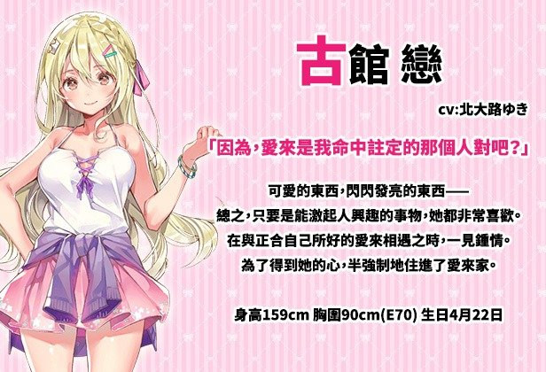 雖然愛來的設定會讓宅腐玩家非常有共鳴,但我還是無法推薦大家這款遊戲...CG頗香但角色個性實在不愛QQ 一開始以為我只是討厭戀太吵,可是想到《快樂的失憶》明明我就覺得很可愛,最後反覆思考就是上面陳述的那樣了。