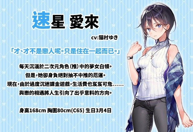 愛來,從事旅館櫃檯的相關行業,明明外貌不差卻不曾談過戀愛,甚至從來沒有思考過自己的性向。隱性宅,非洲居民,一碰到主推的活動就會吃土,可以說是非常常見的宅女。