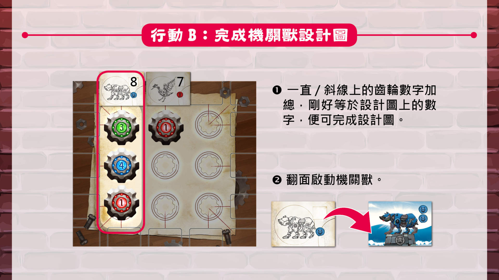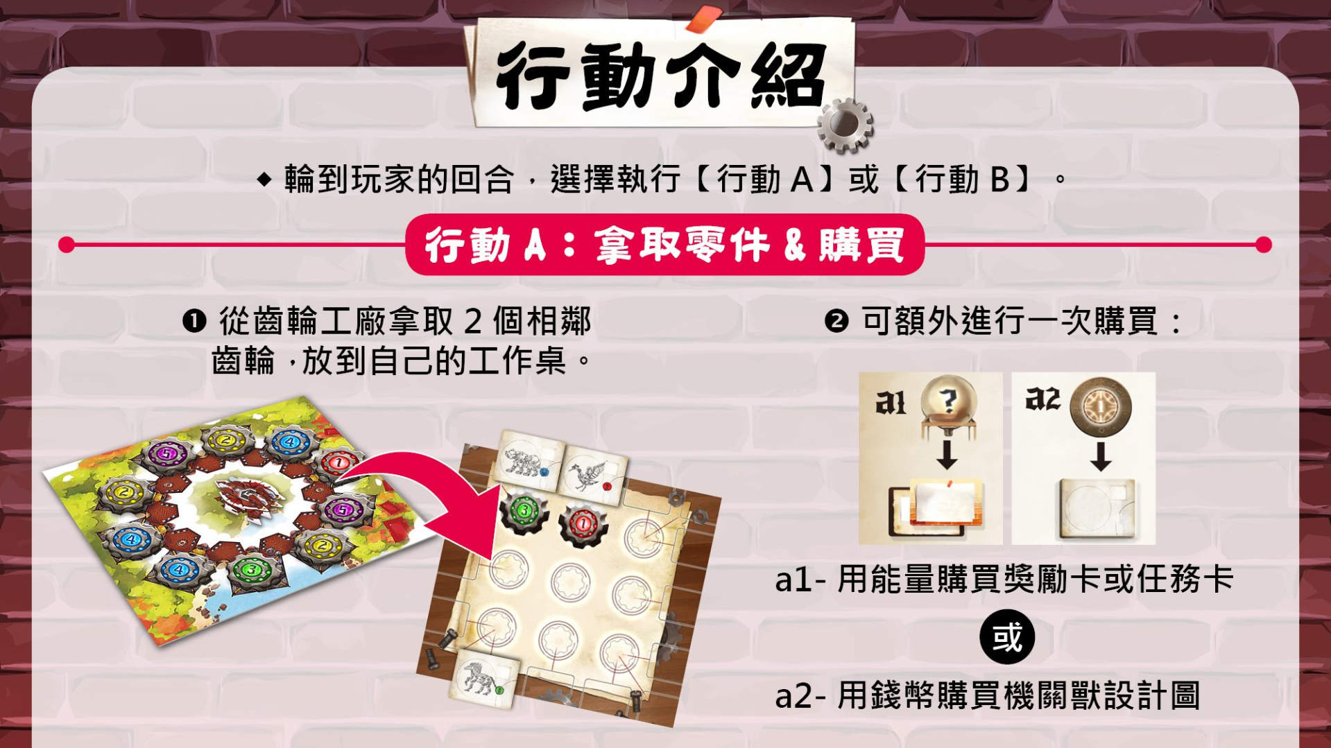 遊戲規則雖然動作不難,但選卡片的互動性以及要配合開出的卡片調整盤面的臨場反應,讓遊戲策略性提高不少,尤其是機關獸完成以及遊戲結束緊扣齒輪,而完成機關獸卡片是獲取分數的重要來源,因為兩個動作選一,往往猶豫會錯失連動得分的良機,但難以選擇和觀察對手陰人也是遊戲中最迷人的地方!(訓練成抖m和抖s無誤!)