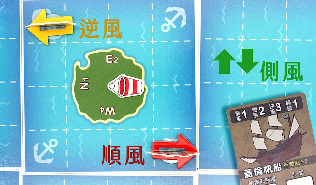 ▲每艘【冒險船卡】的上方都有各種移動情形所需要消耗的點數(每艘船不同)。這邊先教大家怎麼判斷風向,以上圖為例,風從北(N)往南(S)吹。因此紅色的船如果要前進的話就是順風(走一格只要一點),黃色的船如果要往前走就是逆風(走一格要花3點行動)。