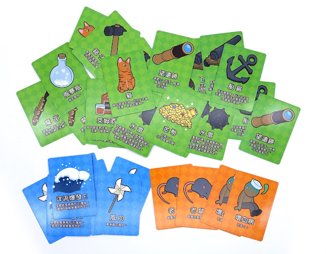▲【運氣卡】:這些卡片的牌背都是藍色的,但翻開之後有綠、藍、橘三種顏色。綠色都是好東西,而且翻開之後可以保留後續使用。藍色跟橘色卡片則是翻開得當下必須立刻執行!藍色卡片則是會影響所有的人風向或是洋流爆發!橘色卡片是壞事,畢竟在海上航行不可能每件事都順心對吧~