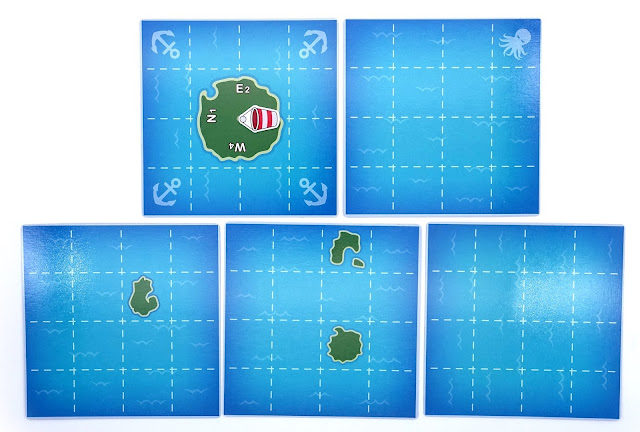 ▲首先把板塊隨機板成上面這樣5X5的矩陣,最中間放中央大島,四個角落分別放有海怪圖示的板塊。把海怪圖示擺在地圖的最邊緣。