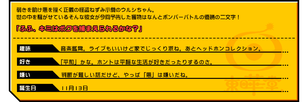 接下來第二位要介紹的是人稱鋤強扶弱的忍者大盜「怪盗ねずみ小僧(怪盜老鼠小僧)」ウルシ(小漆),