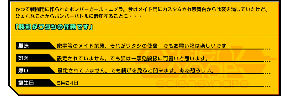 同時也是「ボンバーガール知恵袋」的解說擔當,會向玩家傳達一些有用的小知識。