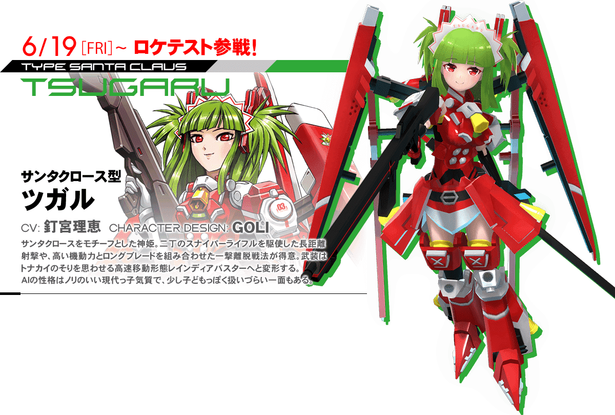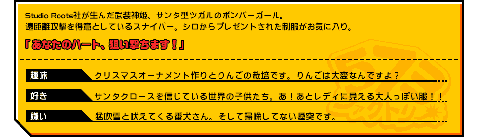 武裝神姬>中的津輕的設計外型充滿著聖誕氣息,擅長使用狙擊槍進行遠距離攻擊,