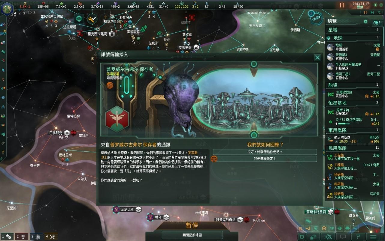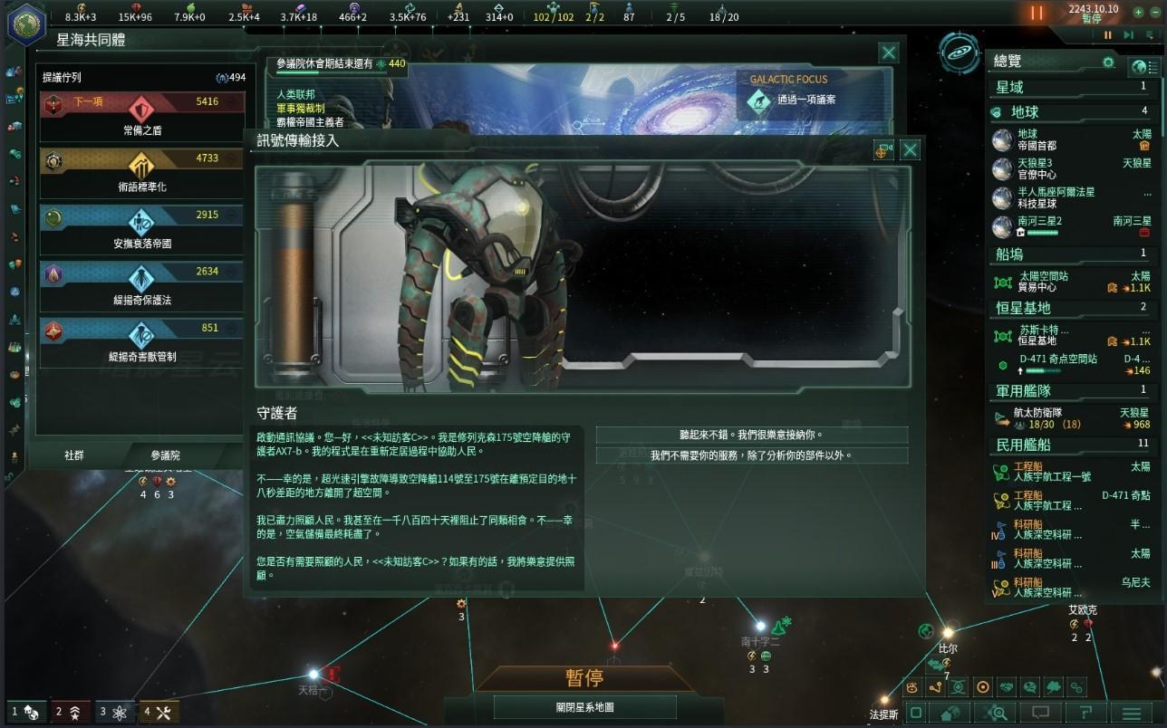 同年10年,我們在遙遠的恆星系中發現了一連串靜靜漂浮在太空中數量龐大但了無生氣看似遇難的外星太空飛船,初步探測後發現了裡面的智慧AI。對方述說自己的遭遇後便表明了願意協助地球聯合國的意願,在確認對方無安全性的問題後聯合國便歡迎它的加入,也從它所提供的資訊中學到一些有用的知識。