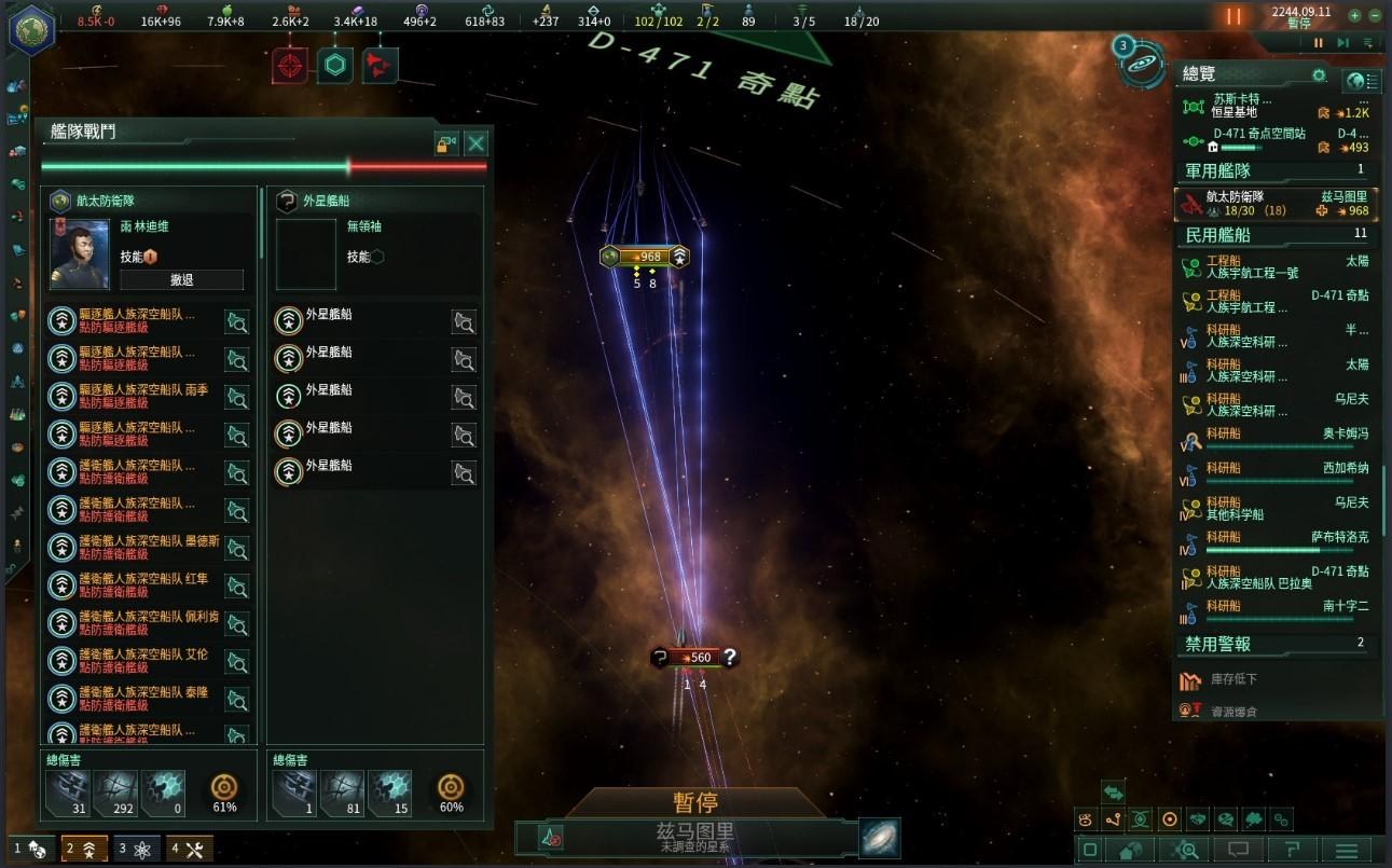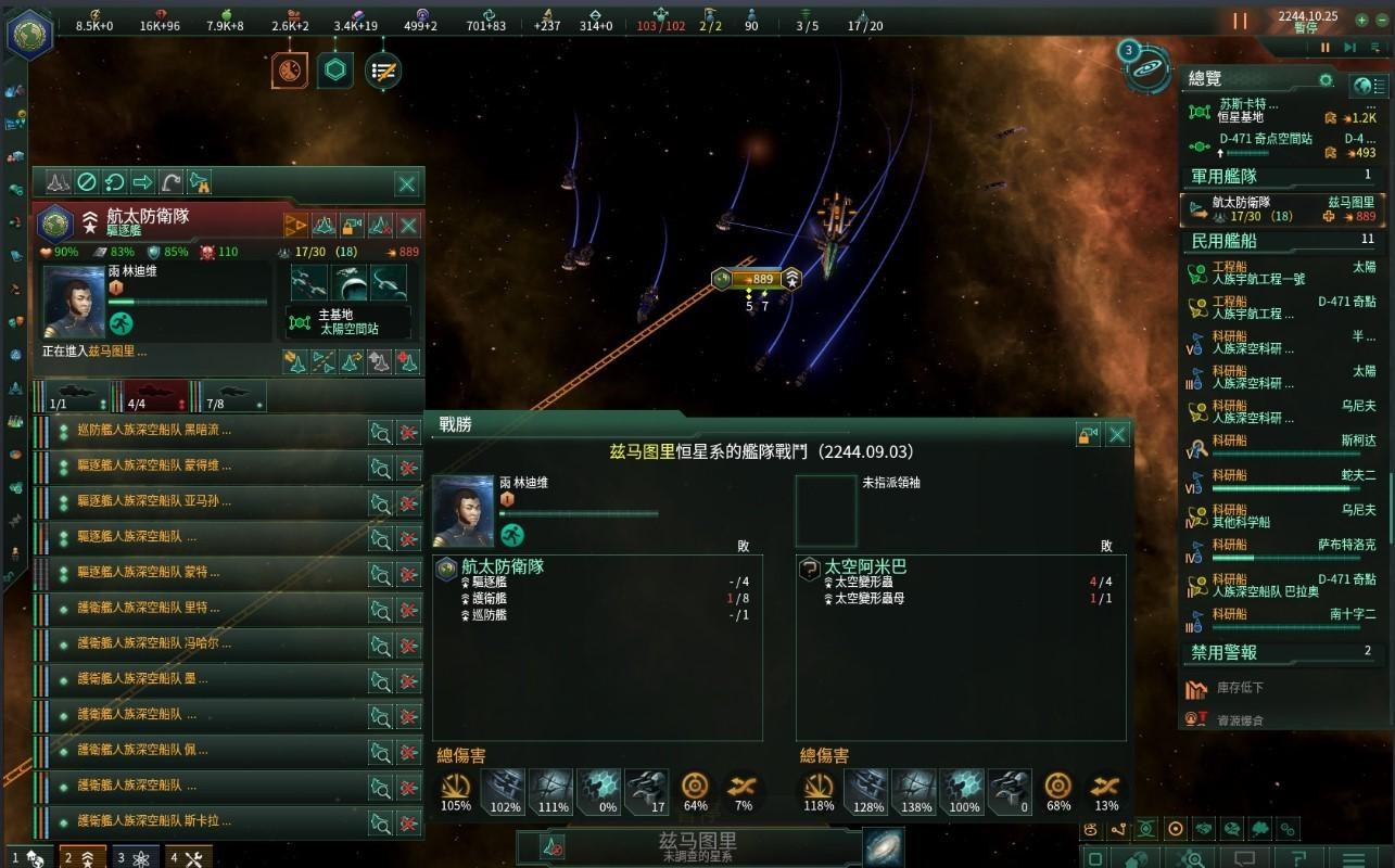 雖然我方擁有數量優勢和火力優勢,但太空變形蟲緊咬單一目標的能力還是對我們的艦對造成了傷亡,戰鬥結果還是以我方損失一艘護衛艦、重傷一艘護衛艦換來全殲變形蟲告終,這是人類史人第一場大型太空衝突,所有作戰中喪生的人員都將被銘記,因為他們的犧牲才讓人類得以打通新的航路並研究這種太空生物的殘骸以及其生存方式與攻擊模式,聯合國也成立了專案計畫,請科學家們研究是否可以找到與太空變形蟲共存而不需戰鬥的方法。