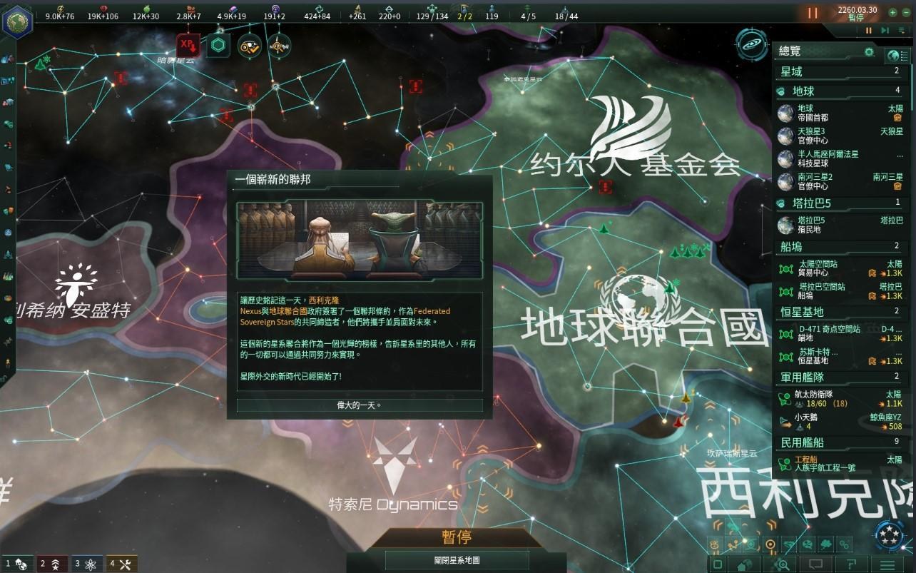 同年3月,我們長期的共同防禦友邦—西利克隆Nexus正式向地球聯合國提出建立聯邦的提議,由於先前與友邦已經就建立更緊密的聯盟這議題來討論了許多年,因為約爾人信奉和平主義,因此已經明確表明如遭攻擊不會主動攻擊敵人。在聯合國評估了與特索尼的惡劣關係不會改善後,便正式同意了西利克隆的提議,除了共同防禦彼此外,兩國共享星圖、已發現的文明、主動發起戰爭前須經過投票討論,兩個並計畫待聯邦關係穩固後,再邀請約爾人 基金會加入聯邦,如果終將與特索尼一戰也勢必得在約爾人加入聯邦前算好總帳。