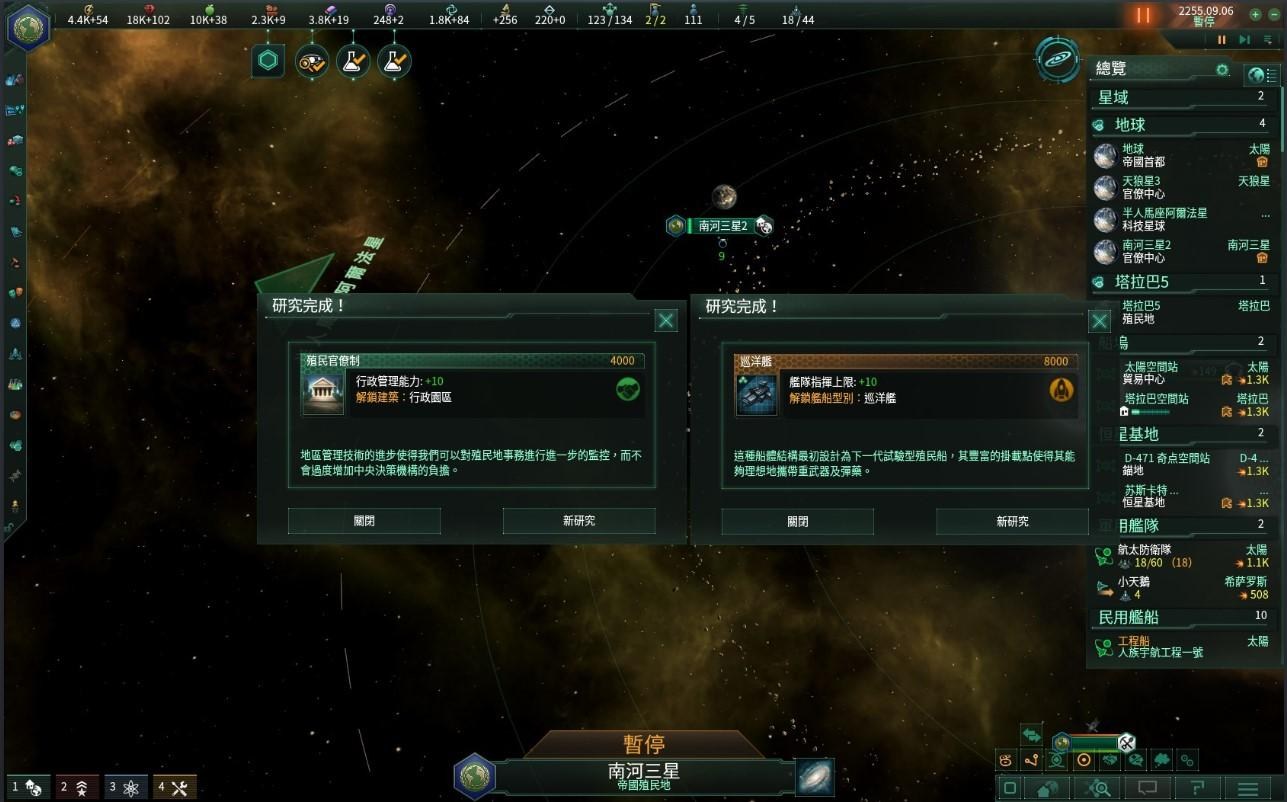 雖然成功建立了第四個人類殖民地,但更遠方的恆星航路已經在兩年前被我們的宿敵—特索尼Dynamics所佔領,雖然短期可以先發展聯合國領域內的行星,但中長期來看如果不尋求突破,人類的發展勢必被限縮在自己的領域範圍內,考量到往後的發展,終究勢必得與特索尼一戰,因此地球聯合國提撥了不少預算鼓勵發展太空工程學,除了現有的驅逐艦級以及護衛艦級戰艦,更預計在十年內研發出巡洋艦級的戰艦以提供更優越的遠程火力打擊能力、除此之外,武器及防禦的相關研發預算也被提高,舊型的護盾與裝甲在之前科研船所遭遇的太空遊牧民族面前根本不堪一擊,有必要增加自身實力面對任何可能潛在的威脅。除了軍事科技外,民生科技也有不少計畫進行著,生物科技技術的突破已經讓人類整體平均壽命增加了20歲、在外星發現的特殊水晶、氣體與微粒在輔助我們的工業、科研上都有不錯的表現,聯合國也制定研究計畫嘗試用人工的方式合成這些有益的產物。政治方面,隨著各殖民地的人口都有了顯著的增長,由地球統一管理各殖民地已的方式經無法滿足各殖民地的各方面需求,在星海共同體的產生後各殖民地要求更多自治權的聲音也越來越大,在塔拉巴五號星殖民成功後,雖然聯合國還是有直接管轄權,但各近地殖民地的政府正式被賦予和地球內國家同等的政治權力並明訂往後成立殖民地政府的詳細規範。
