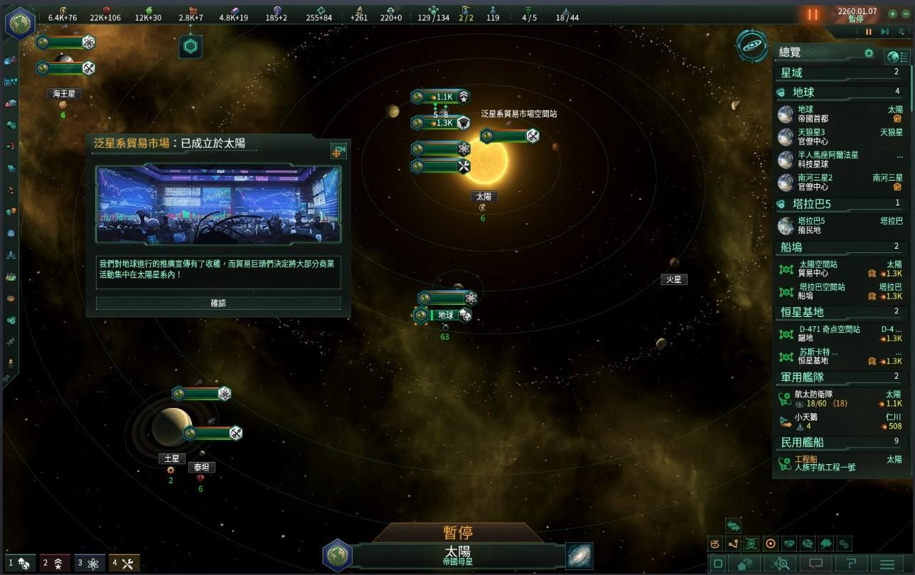 2260年,經過了五年的選拔與投票,在聯合國外交官以及經濟官員們的努力之下太陽系順利的被選為泛星系自由貿易市場的場址,作為東道主,地球聯合國於貿易市場具有買賣資源仲介費減少10%的優惠,白話一點就是我們買賣資源時可以獲得更多星海共同體通用幣來協助我們的發展,例如:行星改造的花費、購買我們所缺少的資源…等。聯合國也預期這將帶給太陽系內更多額外的工作機會,促進聯合國整體的發展。