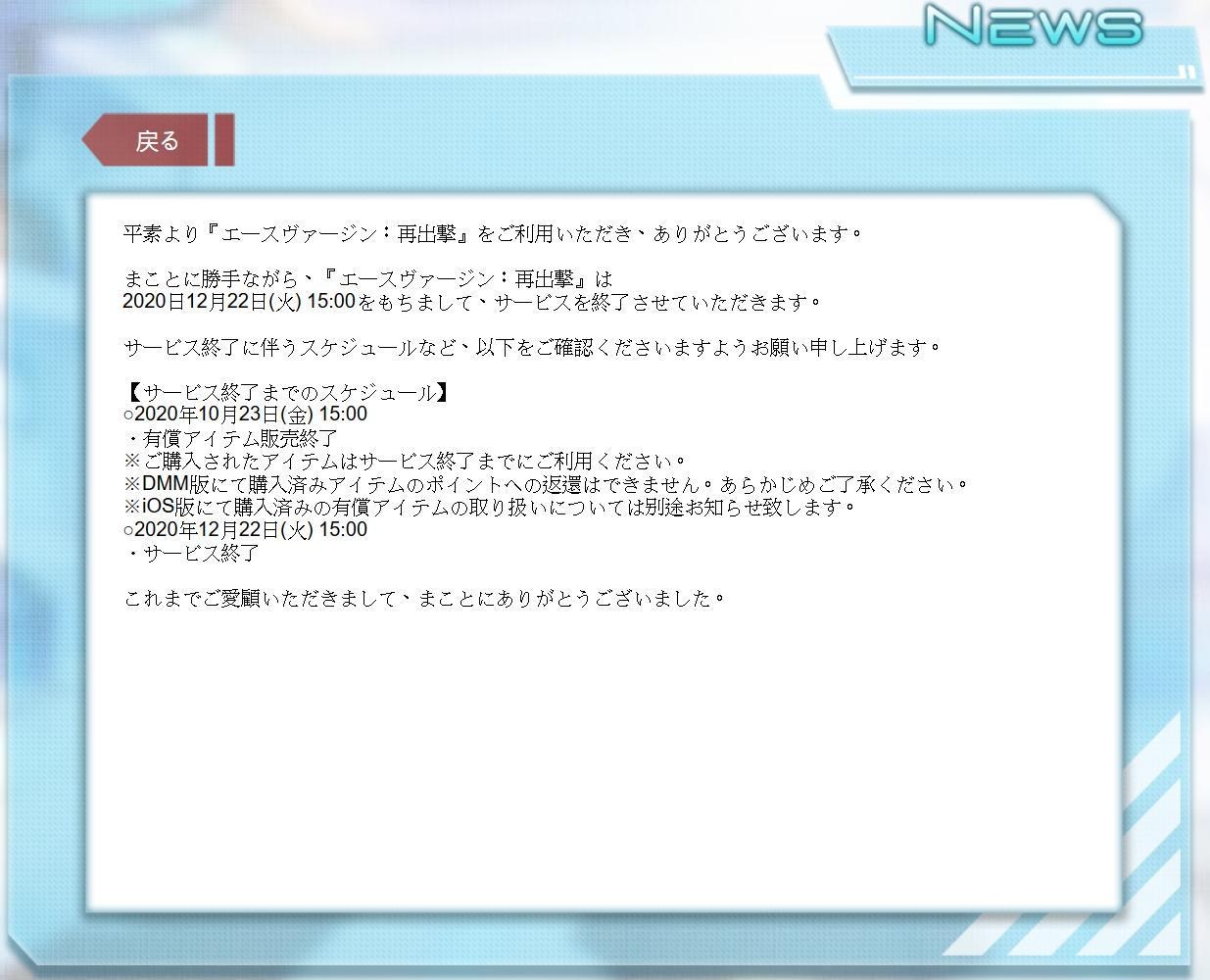 12/22即將停運的公告;本遊戲在2020/3/16上線營運,2020/12/22停運,