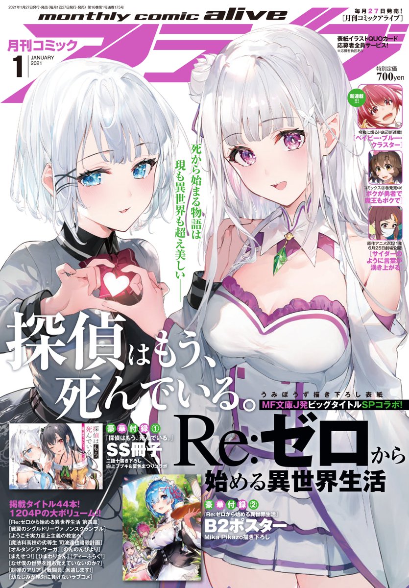 特報其之八,預定將於 11 月 27 日發售的「月刊 Comic Alive 2021 年 1 月號」,封面將會是由原作插畫 ・うみぼうず 所繪製的《偵探已經,死了。》×《Re:從零開始的異世界生活》合作插圖,當中還會附有作者・二語十 撰寫的短篇小說附錄之特製冊子「君塚×シエスタ×夏凪【生放送には絶対に向かない作品】」。