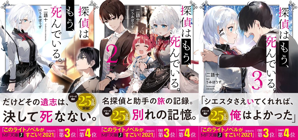特報其之九,輕小說《偵探已經,死了。》系列累積正式突破 25 萬本,為此紀念於第一卷至第三卷的書腰製作特別宣傳。