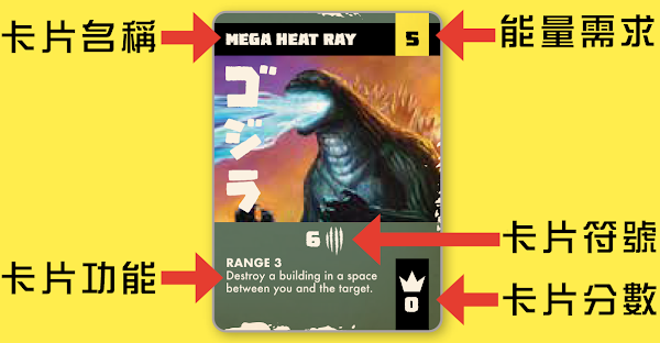 ▲最後,但是最重要,剛剛我們一直有提到受到幾點傷害這件事~但你會發現這款遊戲的怪獸其實是沒有『血量』這個數值的。當你對怪獸造成傷害,你就可以從他的牌堆頂抽牌,然後拿走分數最高的卡片。比方說,我對哥吉拉造成3點傷害,我就從他的牌堆抽3張卡片,然後挑分數最高的那張拿走,其它卡片放回他的棄牌堆。