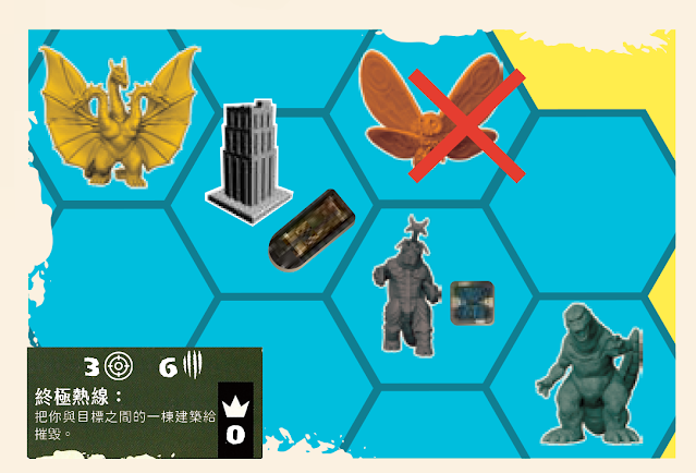 ▲最後用這張圖來講遠程攻擊~這遊戲的遠程攻擊只能用來打直線上的其他怪獸,上圖中哥吉拉發射了攻擊距離3的終極熱線(攻擊力6),他可以選擇攻擊距離1格的甲蟲或是距離3格的王者基多拉,但是就是打不到不在直線上的摩斯拉~遠程攻擊不會被建築,交通工具或是其他怪獸阻擋~