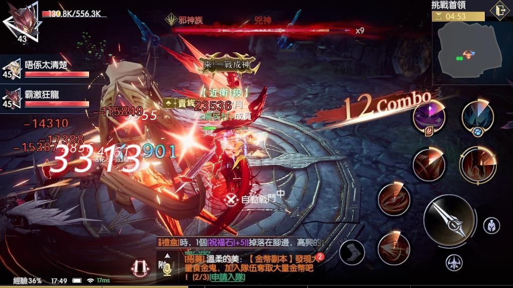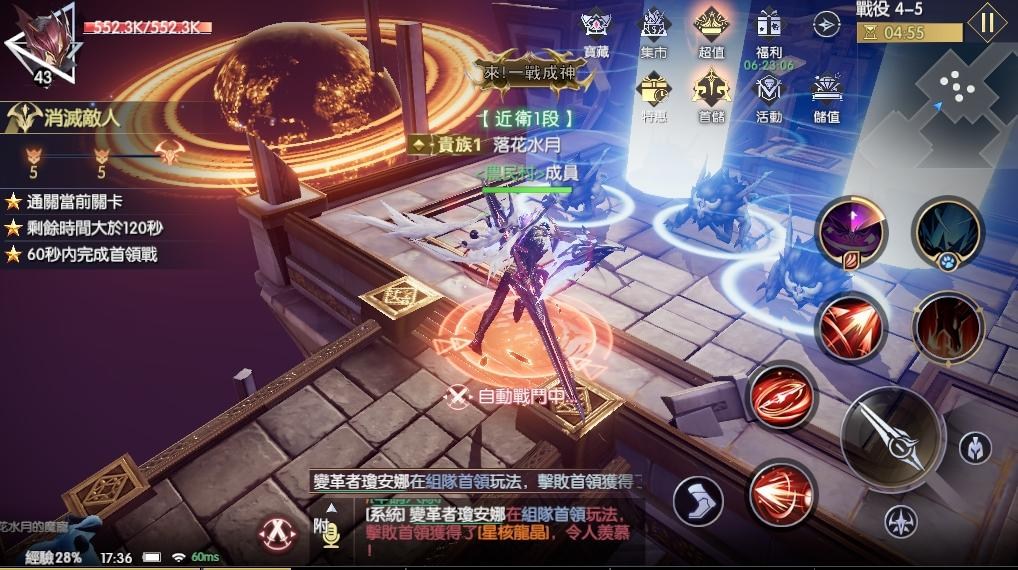 遊戲中的PVE玩法非常多,除了跟著主線走的戰役關卡之外,還有可以獲得經驗跟翼靈的秘境奪寶、獲得高階裝備的天域令、跟隊友一起TD守塔玩法的守護水晶…等等,像上圖就是難度非常高、非常考驗操作的組隊首領玩法,可以獲得高階史詩裝備跟升階石,需要玩家手動操控閃躲首領的攻擊,適時地迴避跟調整位置,不然就很容易翻車唷。