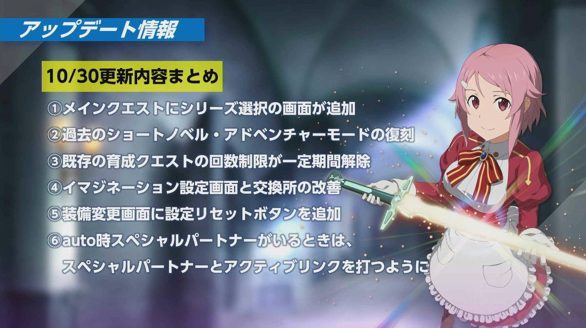 年末日程表方面, 自 10 月 30 日(四)至 11 月 20 日為紀念劇場版《刀劍神域 Progressive 無星夜的詠嘆調》上映,期間將會舉辦各個各樣的慶祝活動並且實施活動專屬的活動 PASS,而自 11 月 20 日將會迎來遊戲發行兩周年,期間將會舉辦兩週年諸多慶祝活動並且實施賽季 PASS 以及活動專屬的活動 PASS。