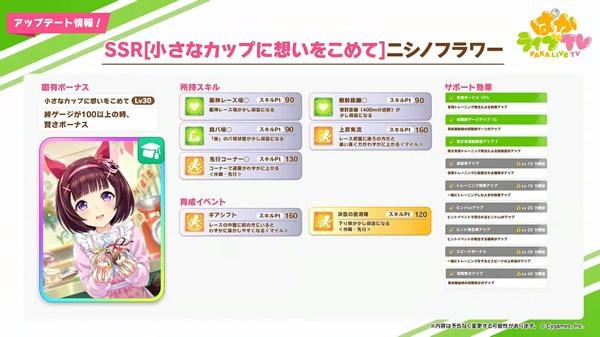 新支援卡池PU角色則為 SSR 西野花 [小さなカップに想いをこめて]ニシノフラワー 以及 SSR 櫻花進王 [爆速!最速!花あらし!]サクラバクシンオー 。