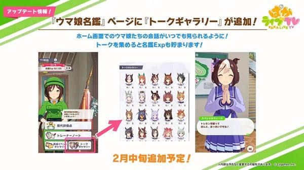 除了活動之外,直播中也介紹了接下來的遊戲改修。首先隊伍競技場將追加『簡短版』功能,以往在出賽時只能一場一場進行比賽,透過此功能可以一鍵完成;再來馬娘名鑑頁面則新增『談話畫廊』,收集在校內各處馬娘們的談話內容也可以獲得名鑑EXP。