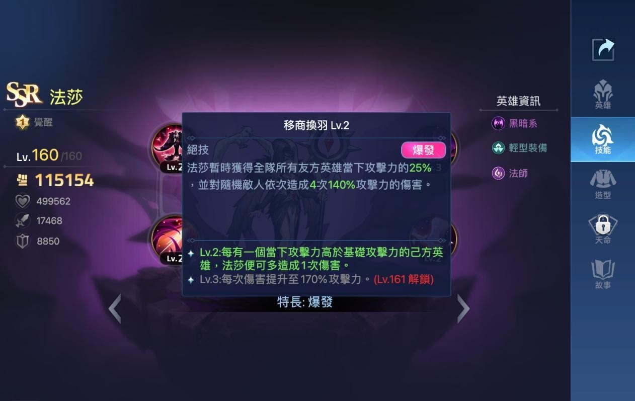 強化除了攻擊力之外,普攻傷害也會特化,很合適一些普傷傷害輸出的英雄,絕技可以獲得全體我方英雄部份攻擊力加成,還能依照被攻擊力BUFF的英雄數量增加攻擊次數。角色可攻可輔,可作為新手或隊伍的第二輸角色(多保一戰術),用在BUFF攻擊力的隊伍和特殊普攻輸出角色等情況使用,缺點就是少了自保和控制能力,靈鴉帶來的沉默為單體且只有0.5秒,效果有限,降低敵人的恢復用在PVP和特殊BOSS上效果比較有用。虛境繪界要25-40才會開啟,內容是有關「法莎」的冒險故事,記得體驗一下拿獎勵,懶得一關一關打的還可以使用時空羅盤推關。