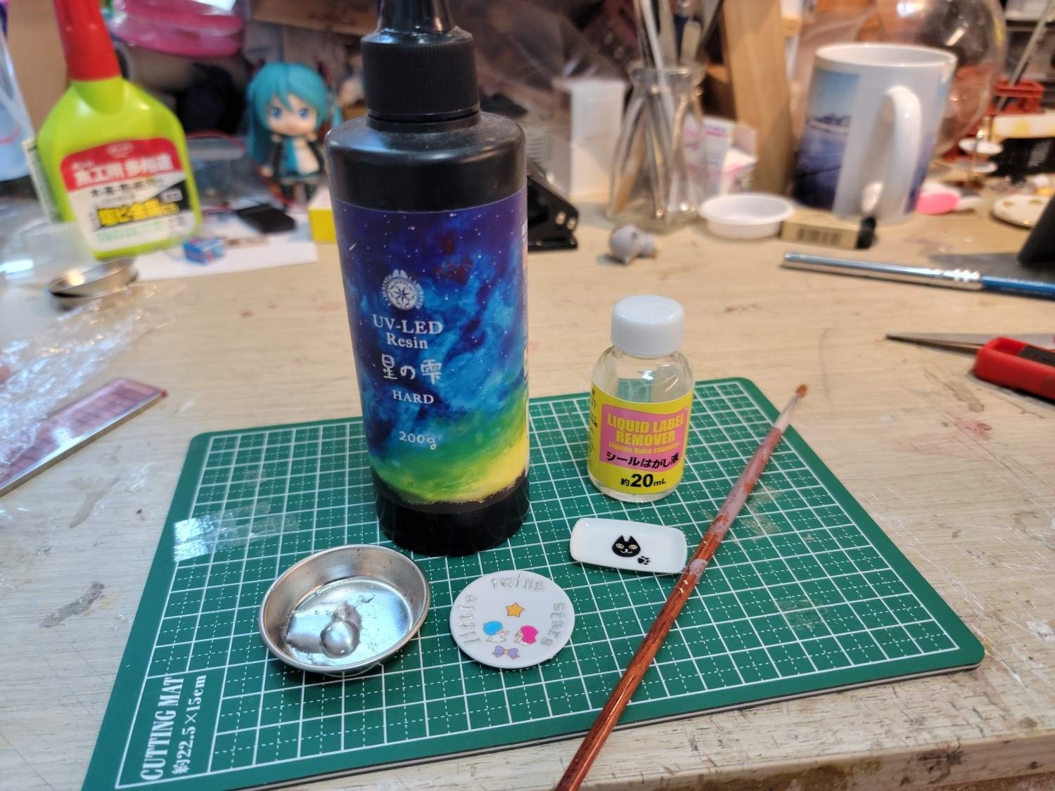 材料有;1)uv resin及消去標籤水(下稱標籤水)(這個是在大創購入的,但我從氣味判斷,這個應該是松節水):uv resin 用作保護指甲水貼防止移位,標籤水方便移除label