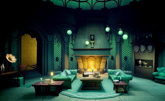 隱藏在石牆內的石門隨即敞開,裡面的景致令史萊哲林的新生們微微睜大眼睛。原來這裡就是史萊哲林交誼廳的入口,若沒被指引恐怕花數小時也找不到這堵隱蔽的牆。