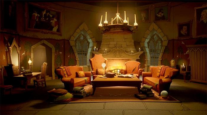 新生們驚呼的繞著葛來分多公共休息室,大圓形的空間擺滿柔軟的沙發,摸上去有些濕濕軟軟,但因為接近火爐,整體很溫暖。一旁還擺有大衣櫥與梳妝鏡,就像放大型的私人寢室。