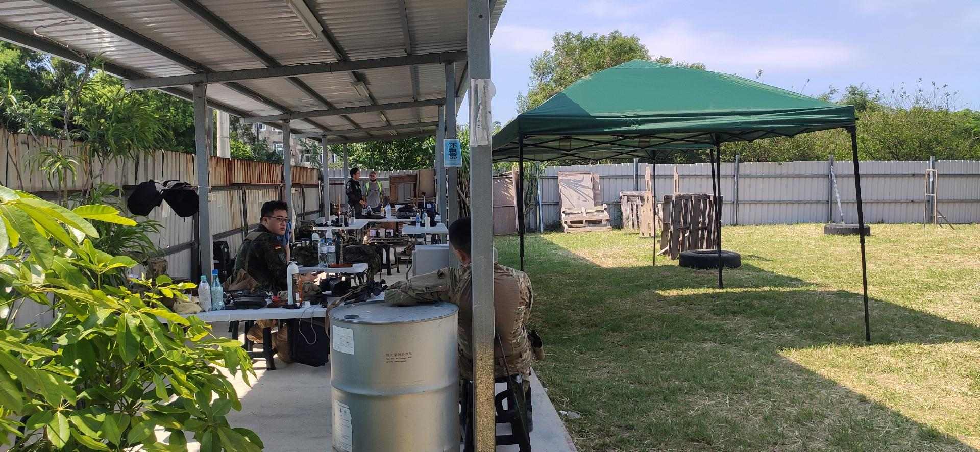 入口的左手邊便是休息區以及試槍區了,休息區本身不大,由方便布置的折疊桌椅及高賓椅靈活配置,極限約可容納20人,設有遮陽棚讓玩家不會被太陽直曬。