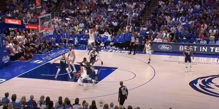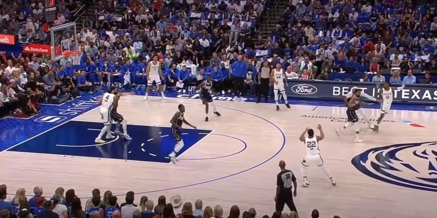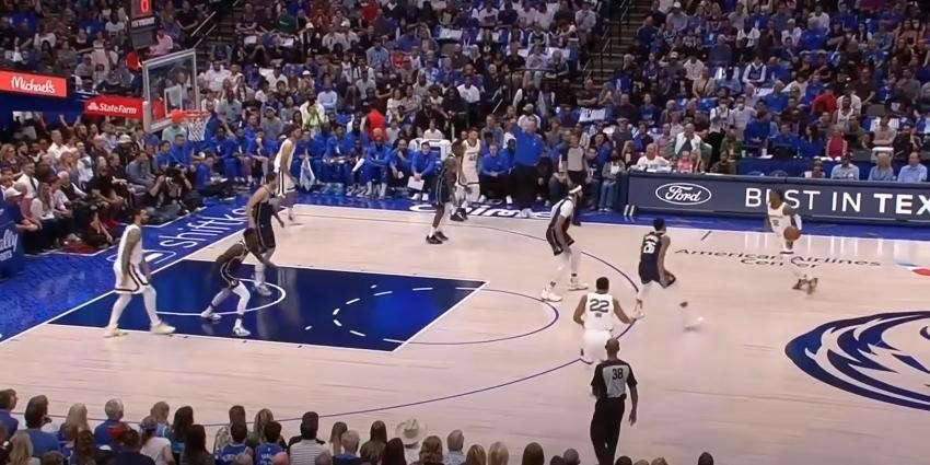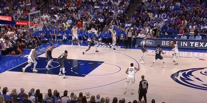 而我們多次提到X-out防守精髓的Bullock再次發揮關鍵作用,瞬間的局部二守一,加上Doncic頂著Adams時仍在隨時可以幫忙Bullock的位置上,使得Morant將球給到看似無人防守的Bane手上,事實上到這裡,灰熊已經完全照著達拉斯防守計畫走了。