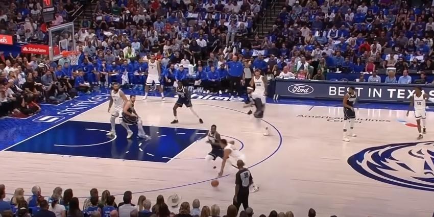 Dinwiddie開始包夾,原本在dunker spot的Aldama往外走到底角,DFS瞬間判斷Morant可能會尋找到被Dinwiddie捨棄看防的Bane,因此迅速往三分線45度進行補防,Doncic則是遞補防守一直在禁區邊緣遊走的Adams,此時Doncic展現了高控衛的防守價值,只要可以瞬間頂住對手的吃餅中鋒,並站在傳球路線上即可。