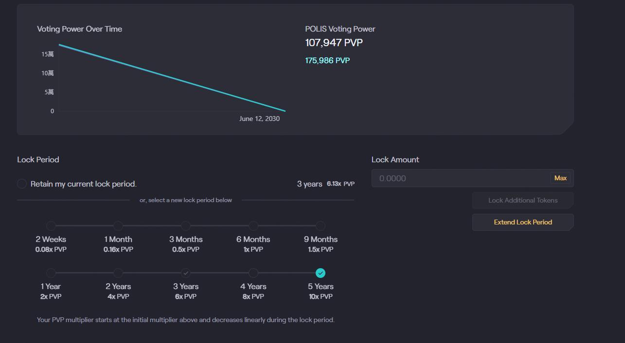質押POLIS幣:能獲得POLIS幣、以及PVP(投票權 Polis Vote Power,一個可以計量的權重點數)。自己設定質押週期。