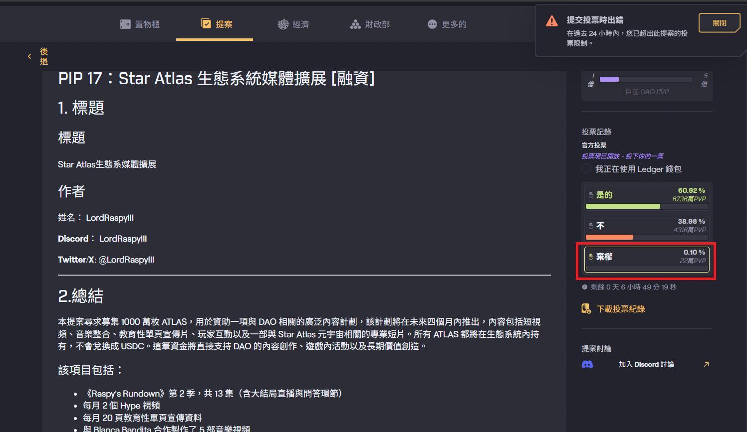 並且只能「修改三次」,超過會出現「過去24小時內,您已超出此提案的投票限制」(不確定是否每天刷新)