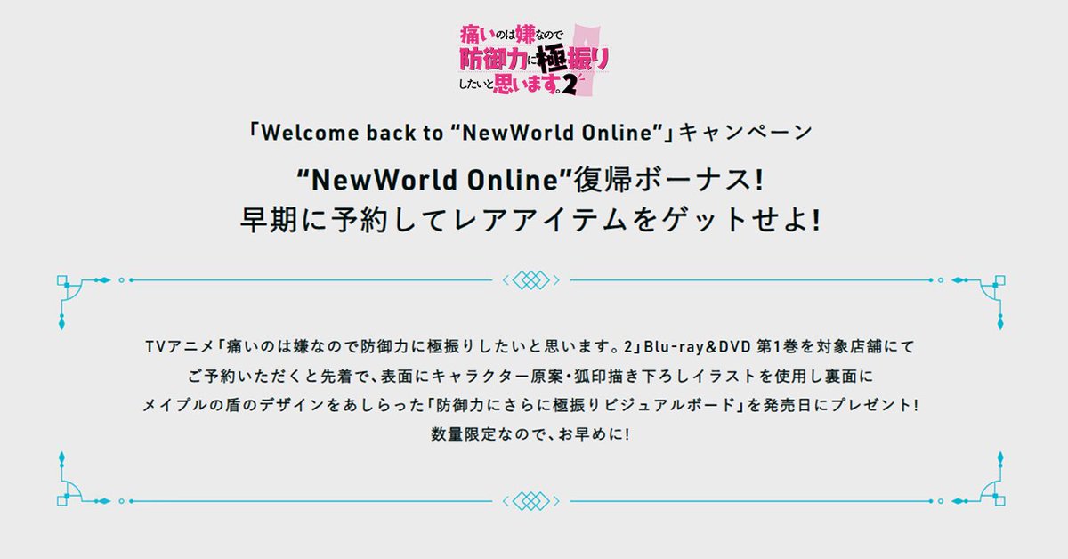 此外在早期預約特典的部分,先行預約購買 Blu-ray & DVD 第一片 完全數量限定版 或是 普通版 的粉絲,可獲得 角色原案・狐印 全新繪製的「防御力にさらに極振り視覺圖板」,並參與抽選含有 本渡楓 & 野口瑠璃子 親筆簽名的第 1 話錄音腳本。
