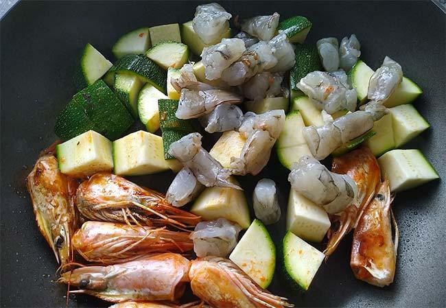 4.倒入蝦仁與櫛瓜丁,蓋上鍋蓋以小火煎2~3分鐘