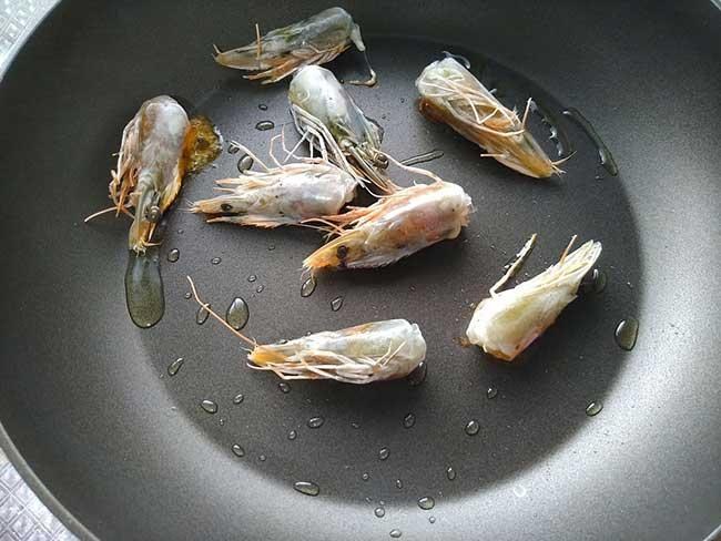 3.不沾鍋中倒入橄欖油,再放入蝦頭煎至轉紅