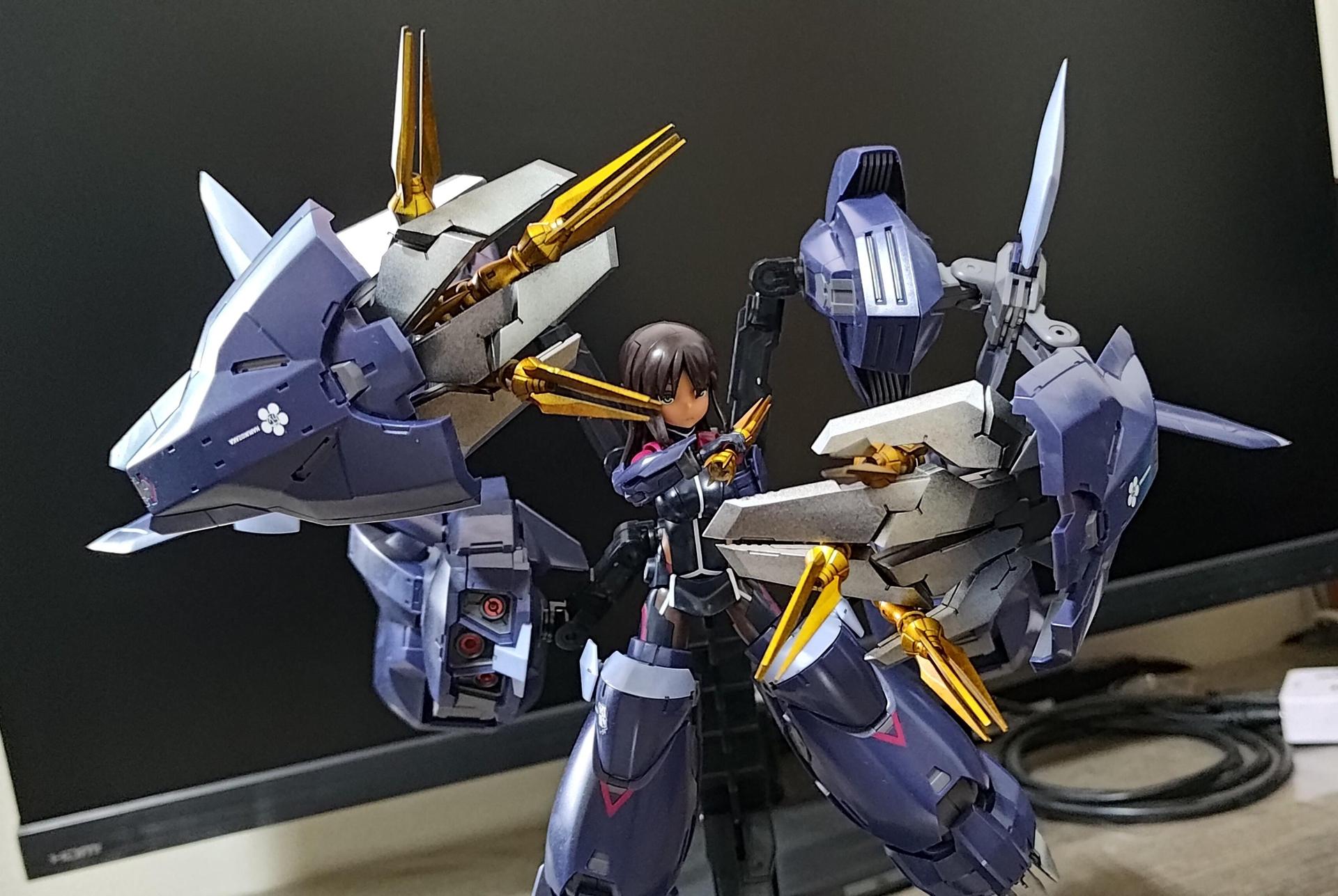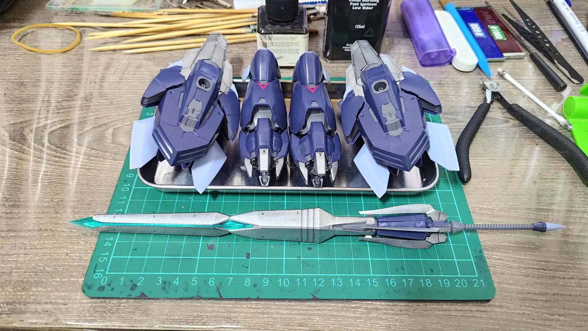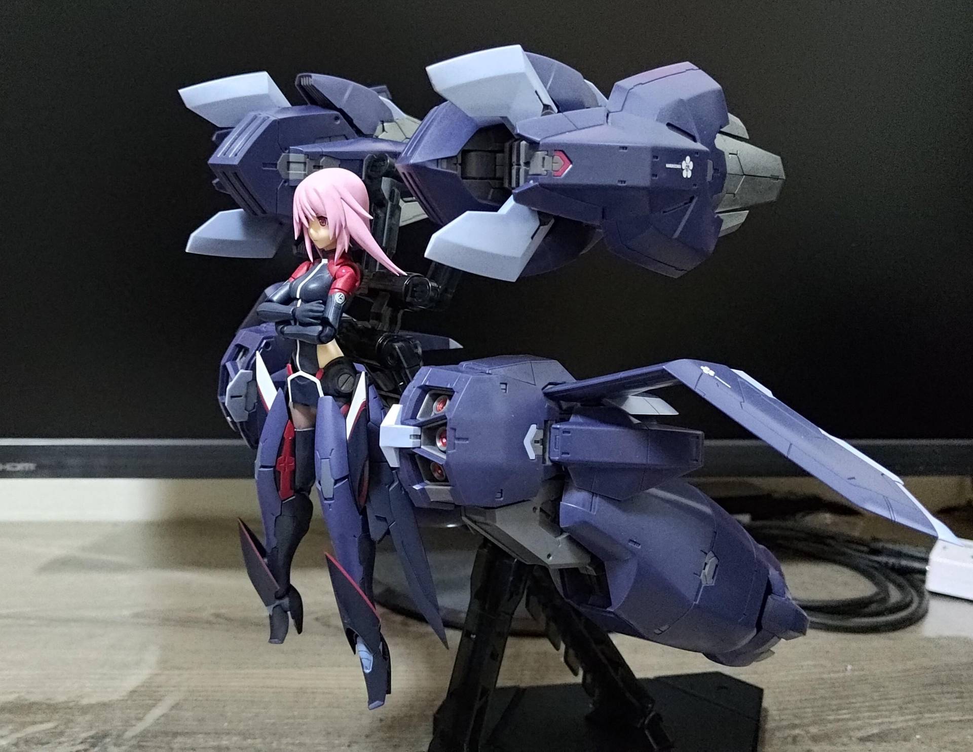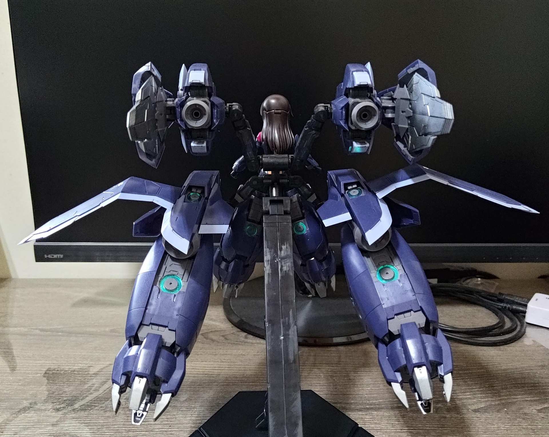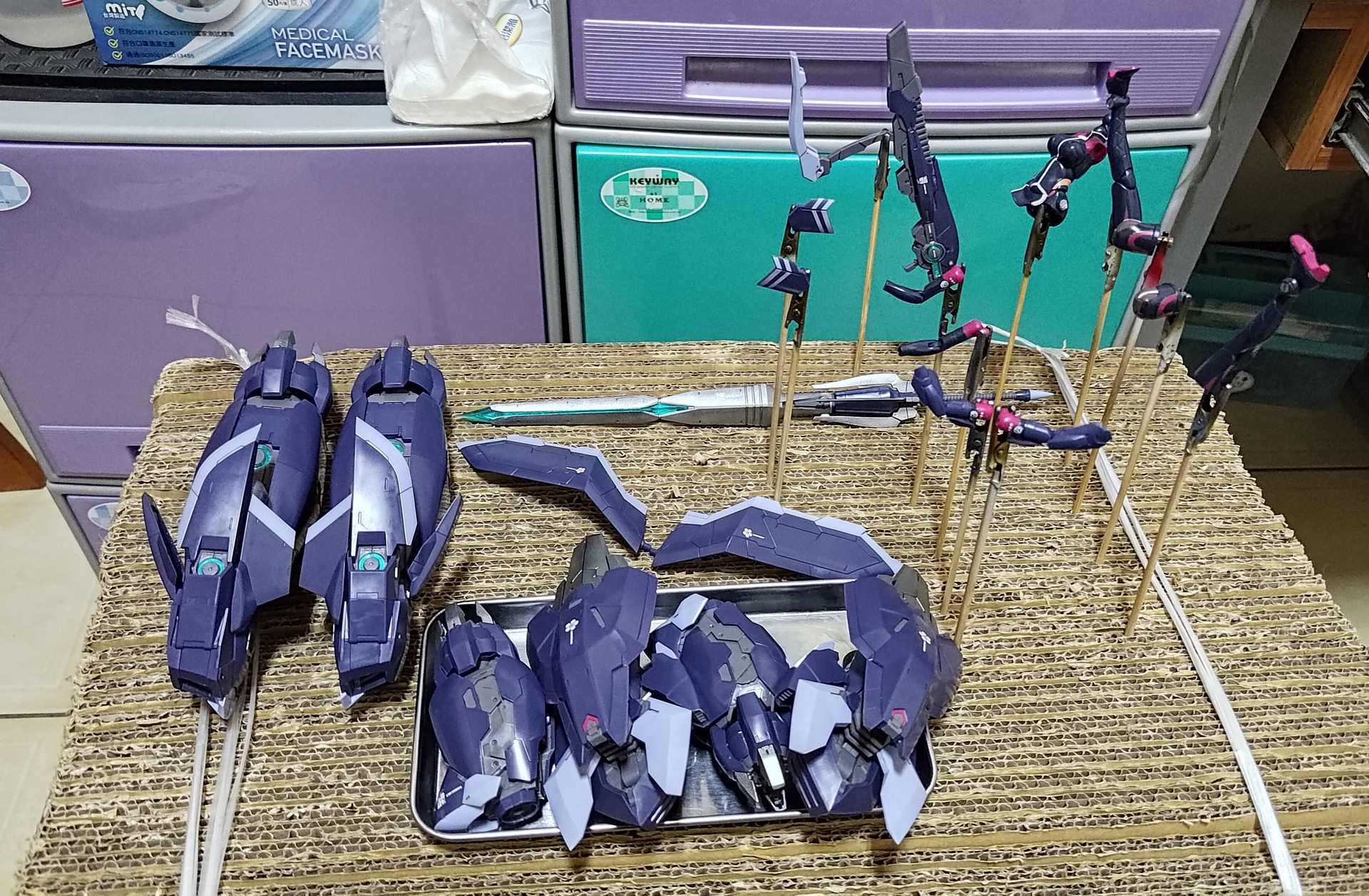 因為天機象神本身配色我覺得還OK所以就沒打算改,原先打算只有把爪子噴銀色跟浮遊砲重噴金色,後來決定腳部裝甲跟後背部末端的腳爪以及長槍槍身也一起噴銀色