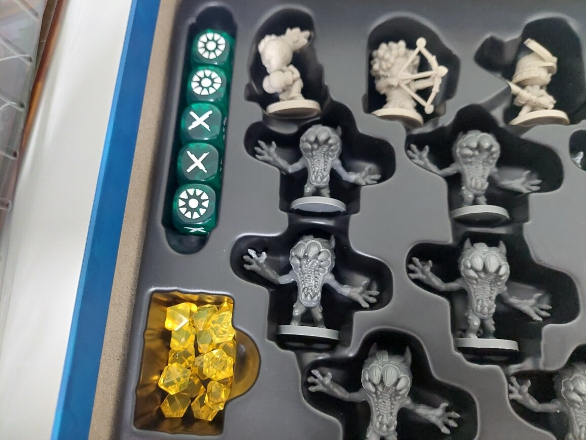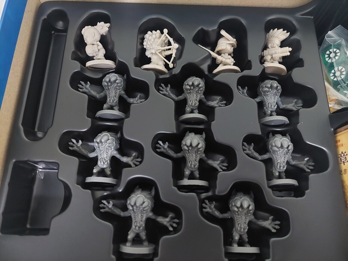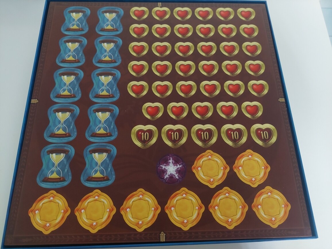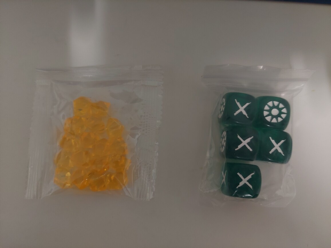 因為還沒開始遊玩,所以最上面那格放著骰子與指示物。
