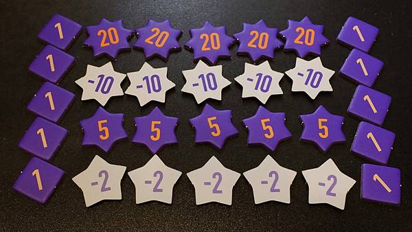 這些計分片的用途,一個是在兩人遊戲,兩人遊戲會有一次中途計分;另一個用途則是玩比較多局的時候,比方說,連續玩三局後再比總分,這時候就會用到計分片。