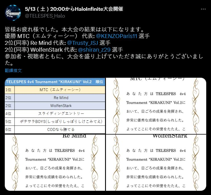 當然,我們 Re Mind 也是其中一支隊伍。只是本來 Looney 是想來跟我們一起參賽的,但由於日本比賽是和紐澳同一天,而當天紐澳的比賽真的是激烈到不行,超出了預期的時間,他們那天打了將近 12 小時,只能說 VERTEX Esports 的各位真的辛苦了。所幸我們臨時有找到人替補,最後仍取得了不錯的成績,以並列第 2 名完賽。非常感謝 TELESPES 主辦這場比賽。