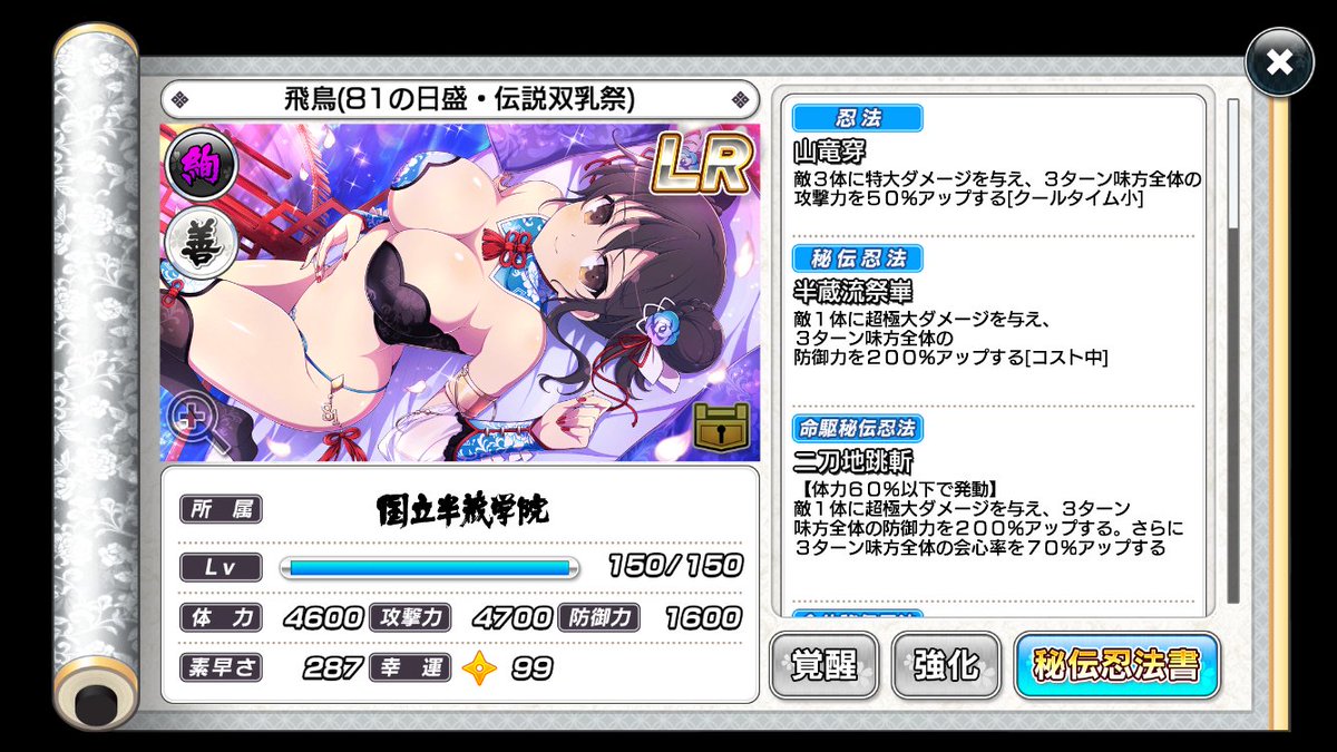 本次PU的81日新卡片為 LR 飛鳥 飛鳥(81の日盛・伝説双乳祭) 以及 LR 斑鳩 斑鳩(81の日盛・伝説双乳祭) 〈此為覺醒後的稀有度以及衣裝〉。