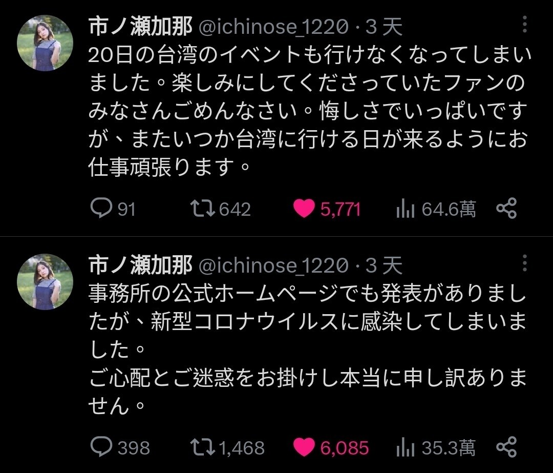 本來滿心期待要見到市ノ瀬加那本人了,沒想到8/19她的推特發文......