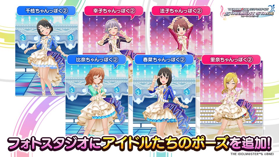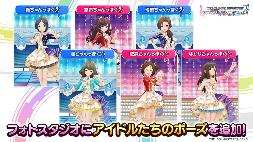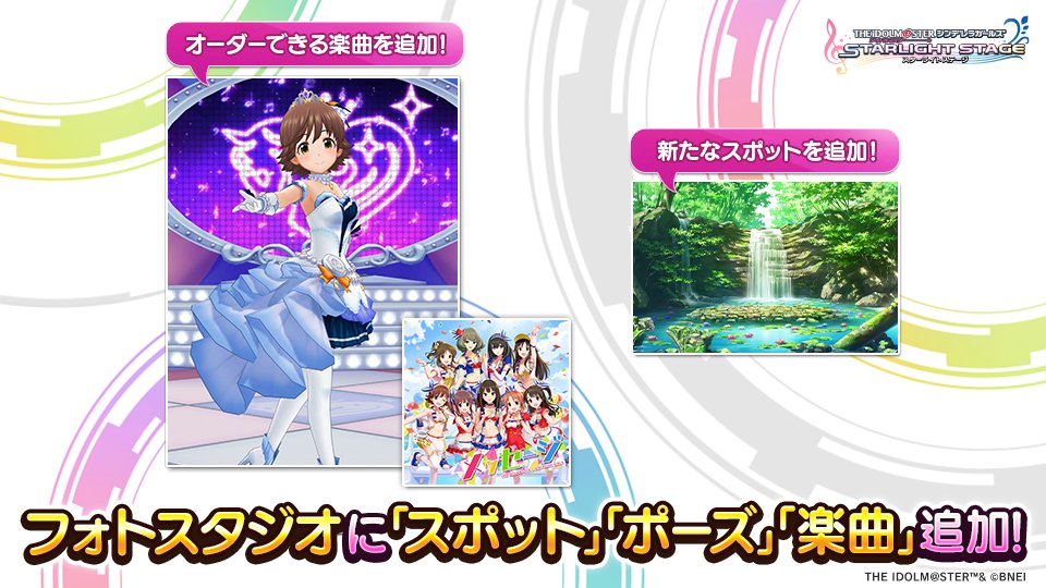 相片拍攝更新方面,追加透過星星碎片交換相片拍攝用景點「Sunshine See May」以及 12 種偶像姿勢,並在可訂製歌曲內追加「訊息」,對於全新追加的姿勢公開了 12 種姿勢。